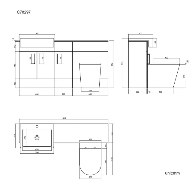 Harper Charcoal Elm Combination Vanity Basin with Marble Top & Boston Toilet 1500mm - Black Accents